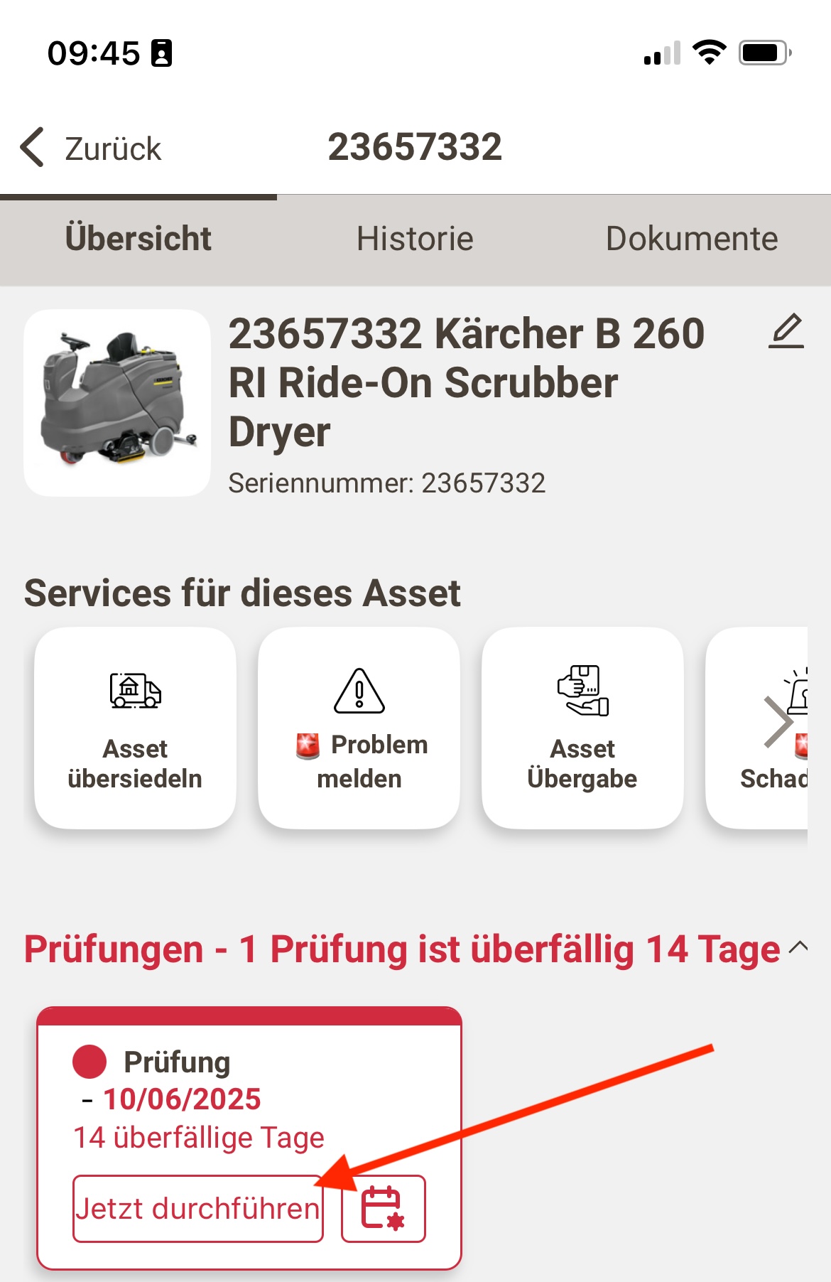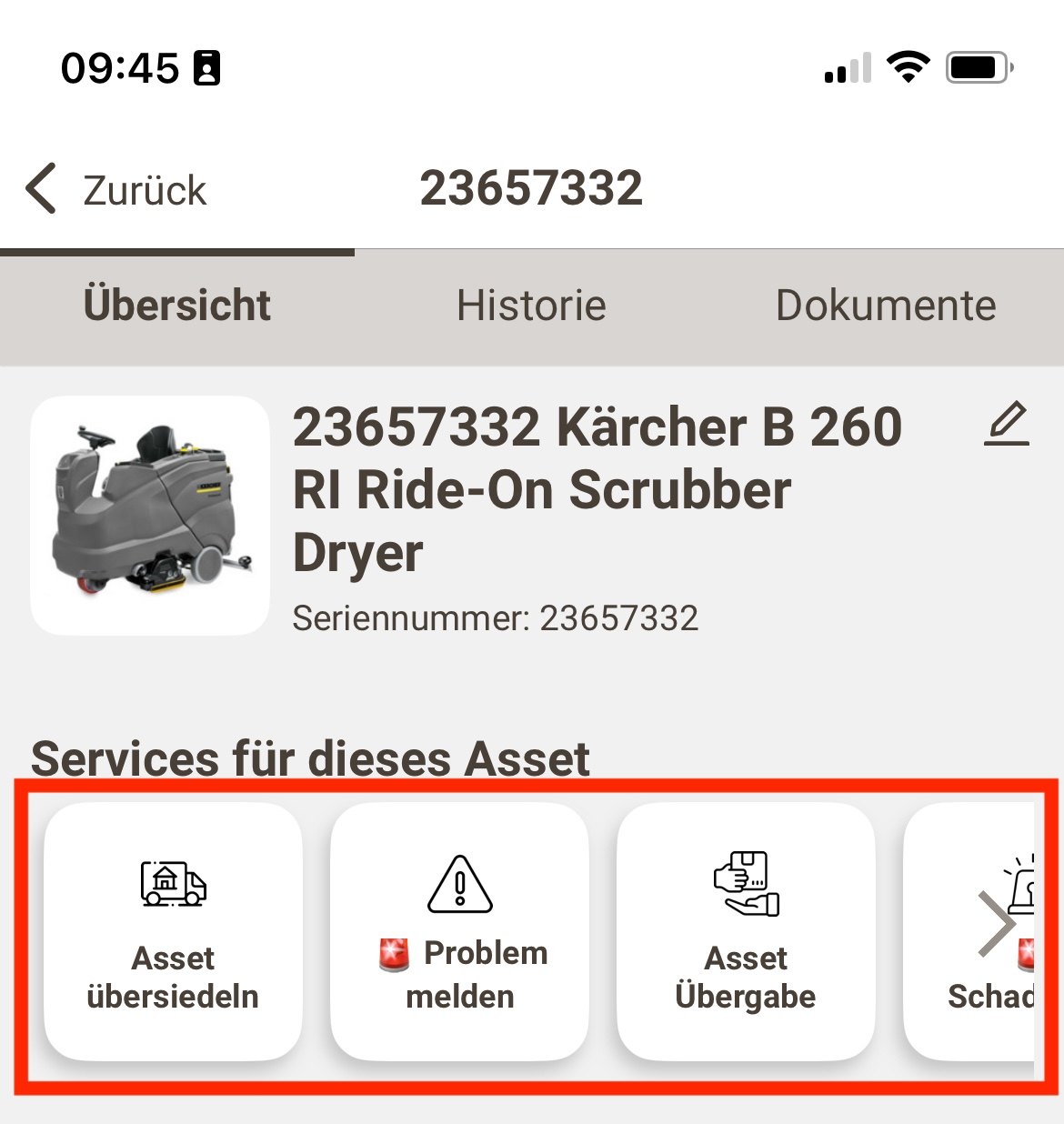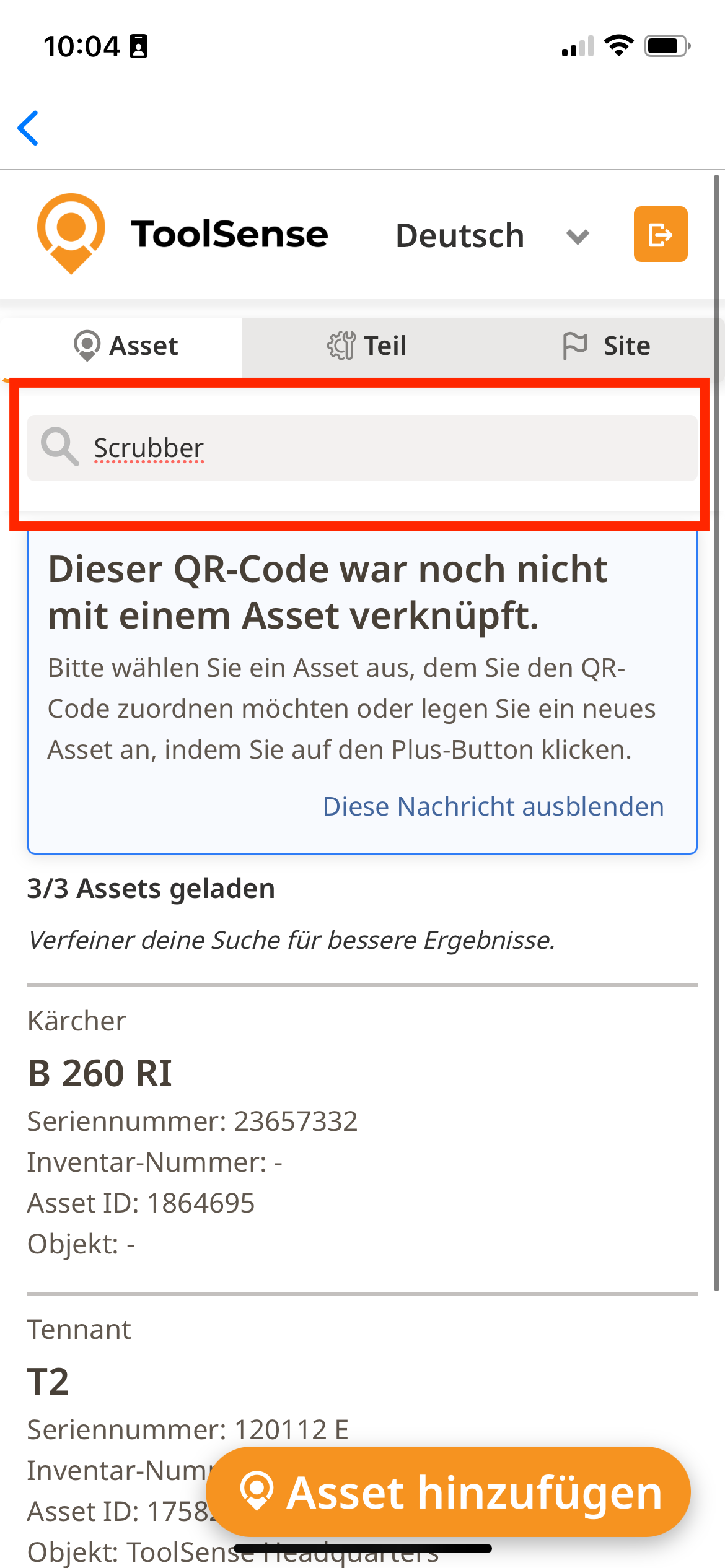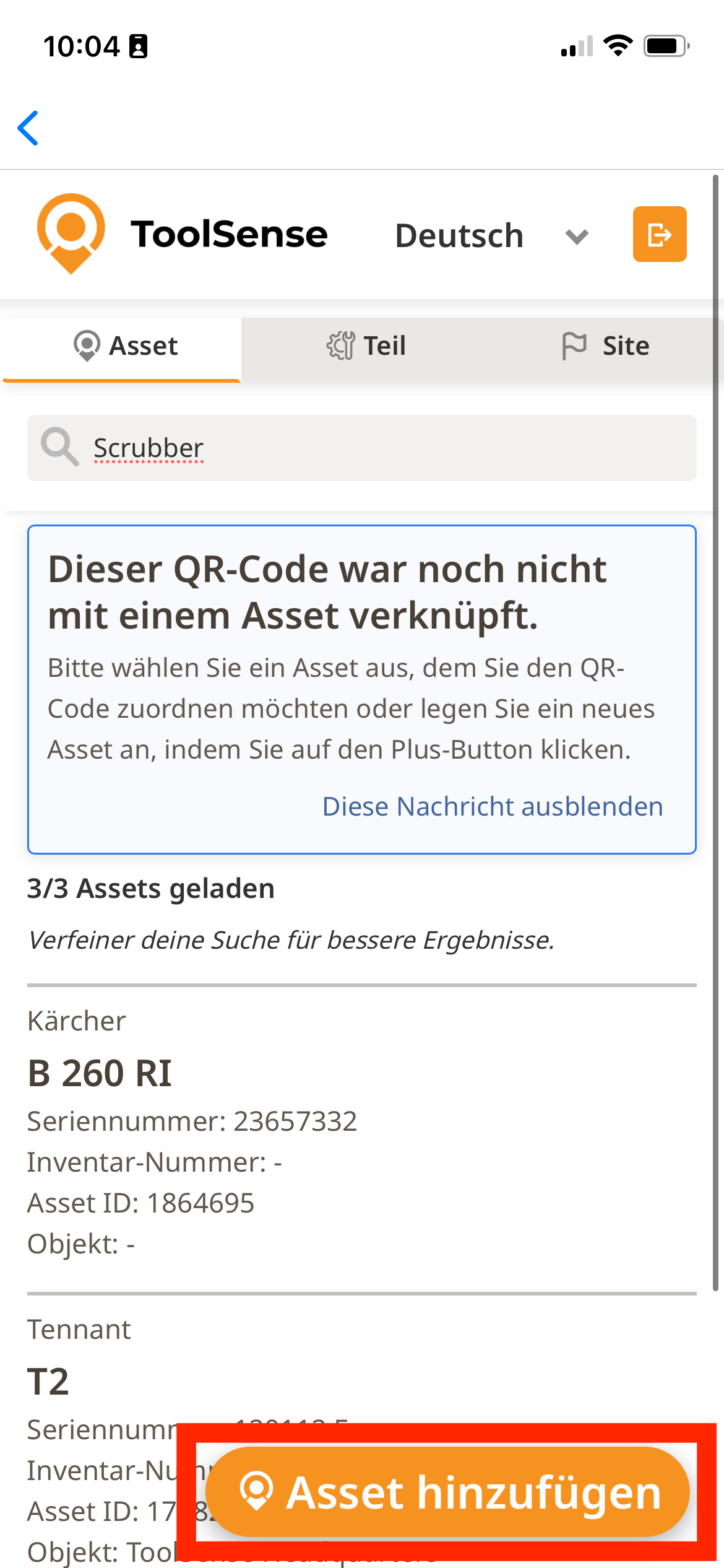 Öffne das Asset über das Scannen des QR Codes/NFC oder über die Suchfunktion.