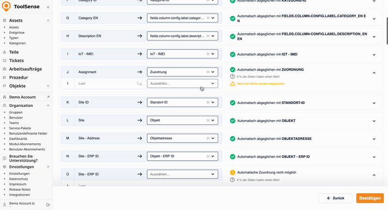 Sofern die Importvorlage genutzt wurde oder die Spaltenüberschriften mit unseren Feldnamen übereinstimmen, schlägt ToolSense automatisch die richtigen Zuordnungen vor. Bitte überprüfe das matching trotzdem kurz.