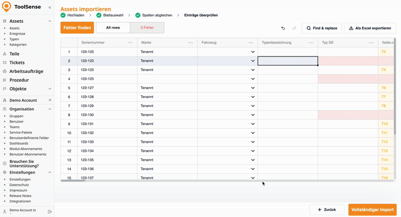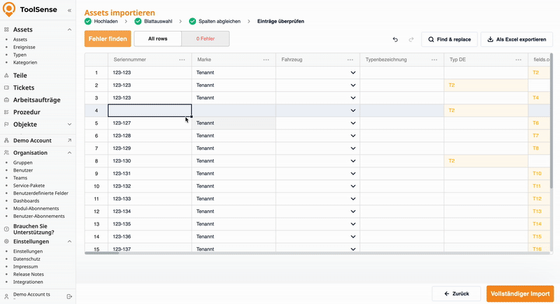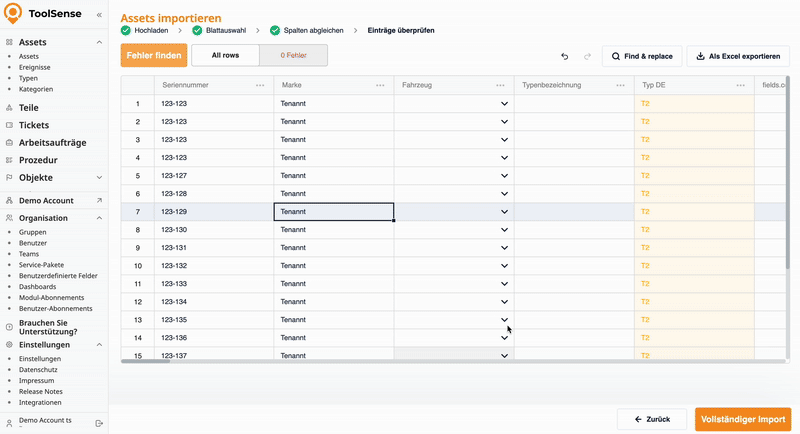 Nun öffnet sich die letzte Übersicht, in der die Daten überprüft und bearbeitet werden können. Falls das System Fehler erkennt (z. B. fehlende Seriennummern), werden diese hier angezeigt.