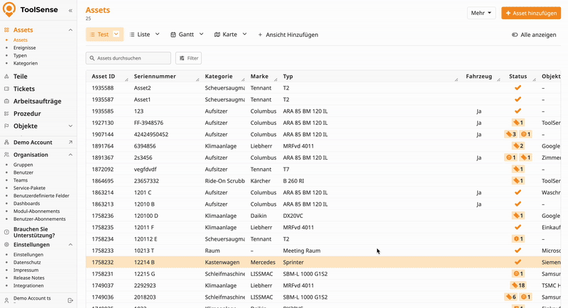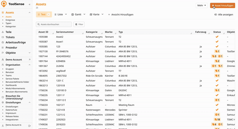 Für alle relationale Daten - wie Typen, Kategorien, Standorte und Gruppen - nutzt ToolSense Farbcodes: