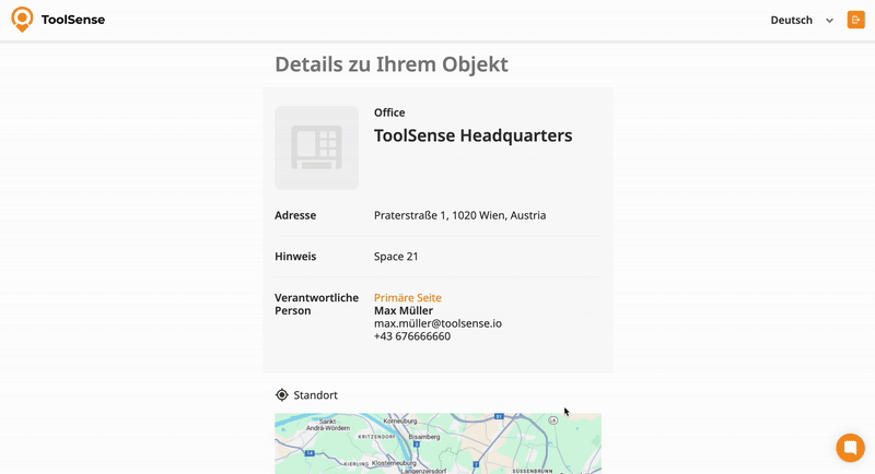Jedem Objekt kann ein eindeutiger QR-Code zugeordnet werden, der physisch am Objekt angebracht ist. Durch das Scannen des QR-Codes wird die Übersichtsseite des Objekts mit den wichtigsten Informationen sowie Optionen zum Melden von Problemen oder zum Zugriff auf Services geöffnet (Zugriff auch für Personen, die keinen Benutzer in ToolSense haben).