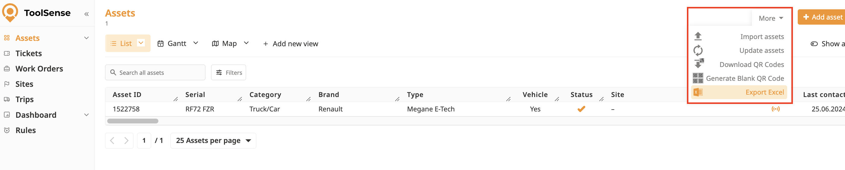 Beginnen Sie damit, Ihre Assets in Ihrem ToolSense-Konto zu filtern. Die Exportfunktion basiert auf den Assets, die in Ihrer gefilterten Ansicht angezeigt werden. Das bedeutet, dass nur die Assets, die Ihren Filterkriterien entsprechen, in den Export aufgenommen werden.Verwenden Sie die in der Benutzeroberfläche verfügbaren Filter, um Ihre Liste auf die spezifischen Assets einzugrenzen, die Sie exportieren möchten.