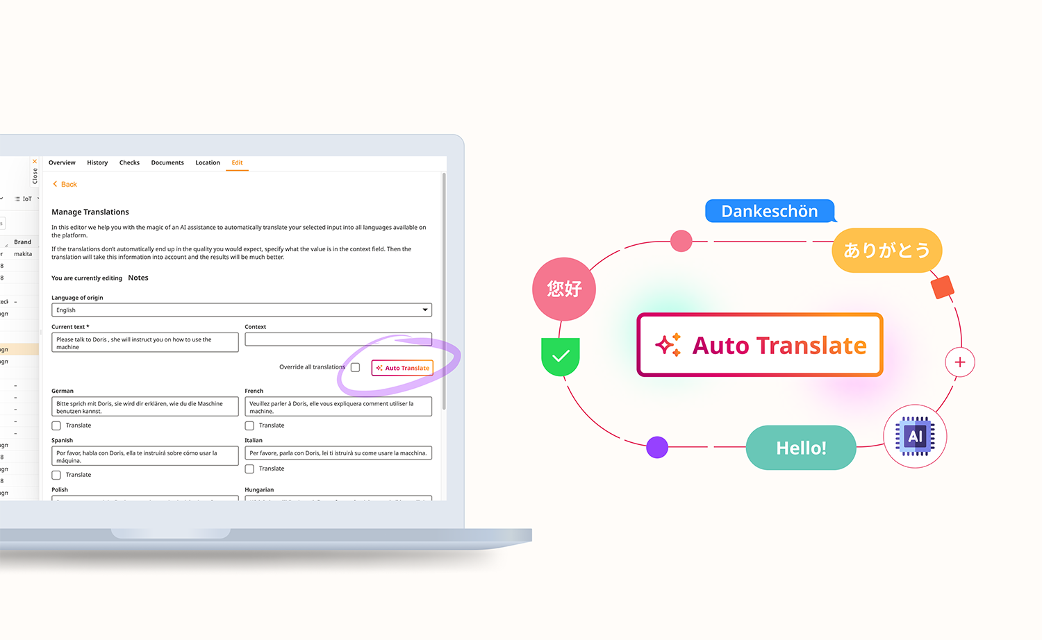 If you want to be more granular with your translation, for example add context to the translation, simply click on the globe icon, select ‘Manage all’, pick your source language, add context if needed, and hit Translate. You’ll get automatic translations, which you can tweak or approve as needed—all within a simple, user-friendly interface.