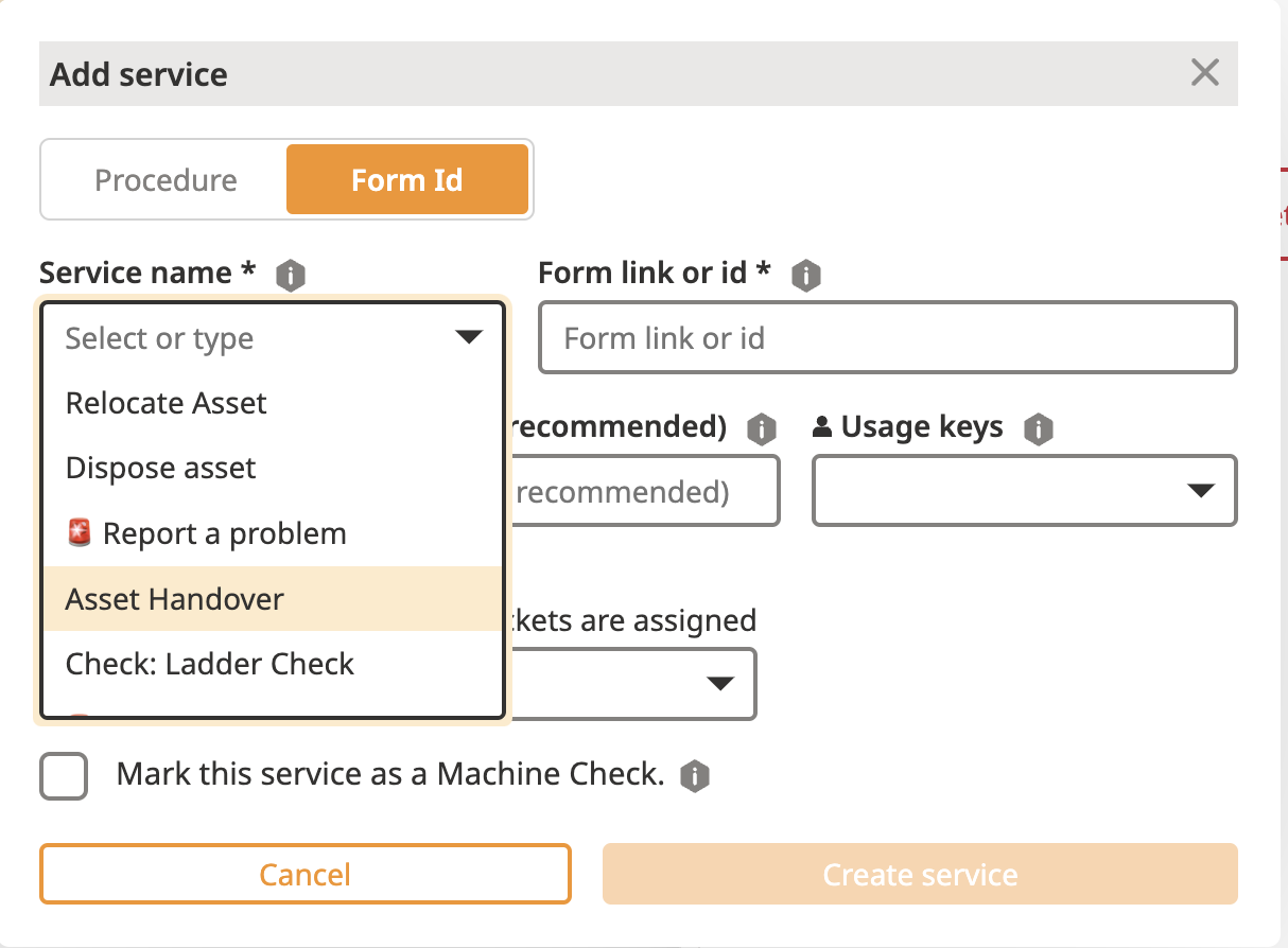Usage Key: Choose "QR Code Landing" to make the service accessible to non-logged users (e.g. Problem Reports).
