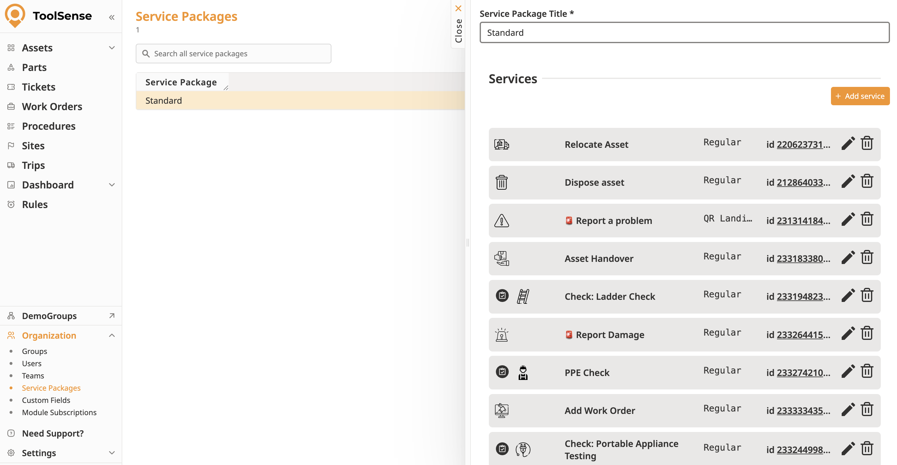 Service Packages are groups of related services that are bundled together to address specific needs. Instead of listing each service individually, a service package lets you manage multiple services under one collection. For instance, a "Maintenance Package" might include services for routine checks, troubleshooting, and repairs for various asset types. Service Packages help control visibility and ensure that only relevant services appear to users based on criteria like asset type or user group.