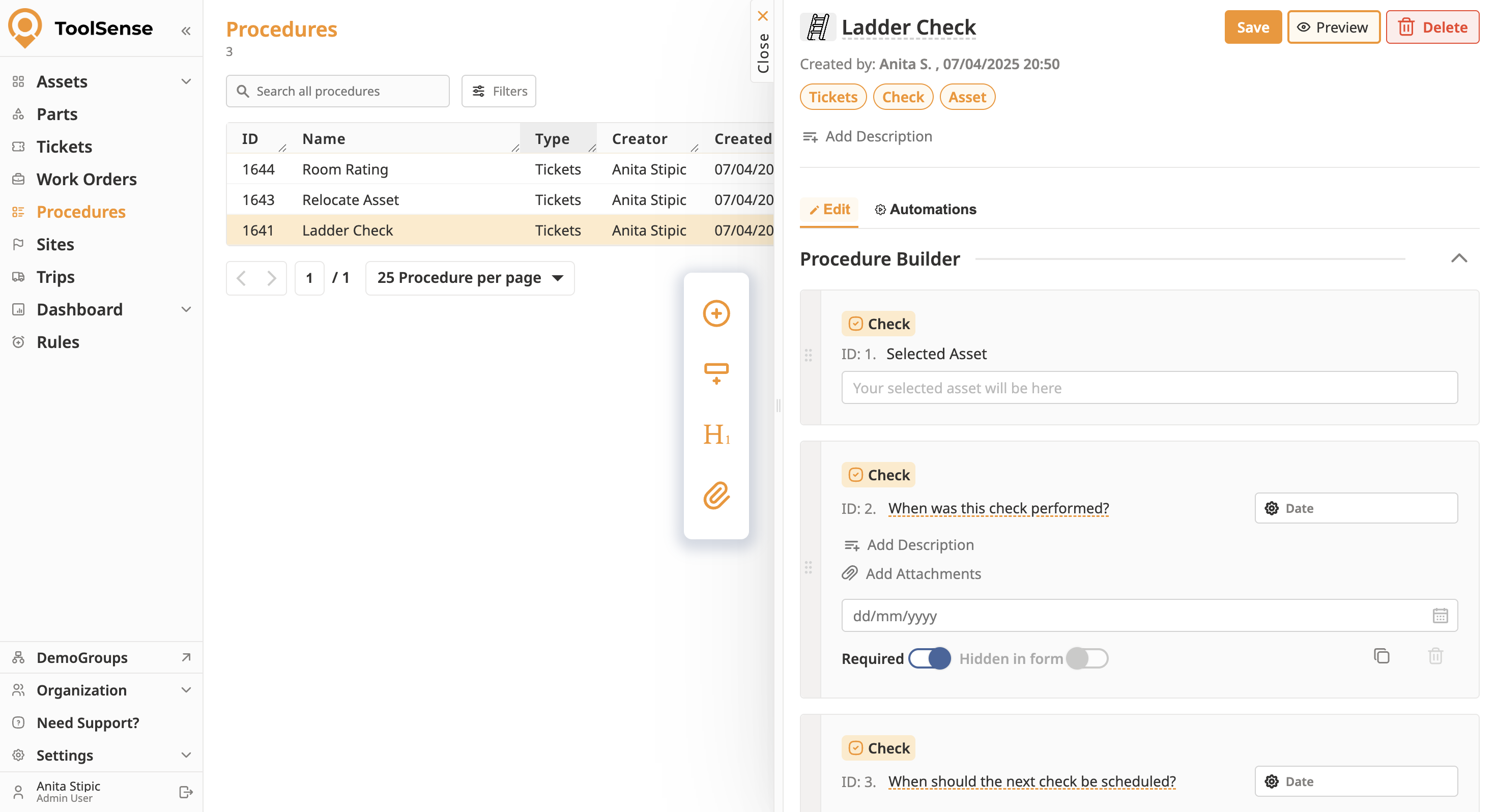 Procedures are an internal tool within ToolSense that allow you to create custom forms. They offer flexibility in structuring tasks, enabling you to define specific steps, collect data, and ensure tasks are executed consistently - and even automatically.