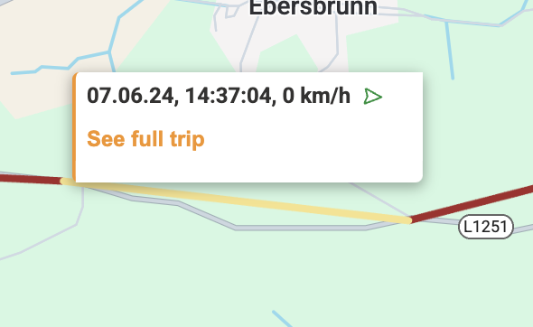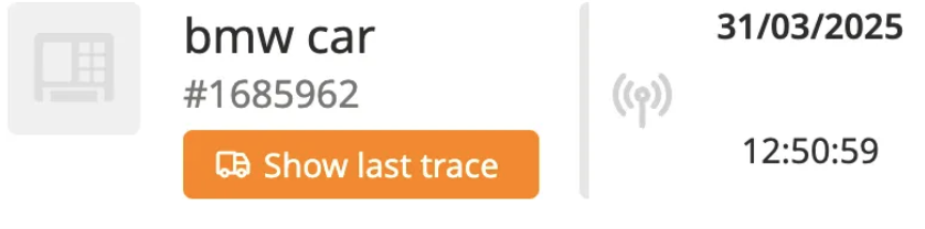 Asset Overview: Click the Show last Trace button in the Asset Overview of the asset, which is marked as a vehicle and has a connected IoT tracker. The system will navigate to the Trips Map and use the Vehicle traces Mode, displaying the selected vehicle’s last trace.
