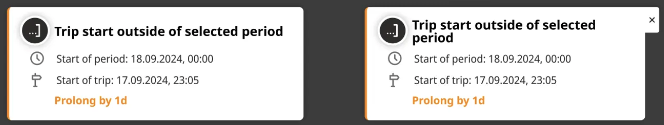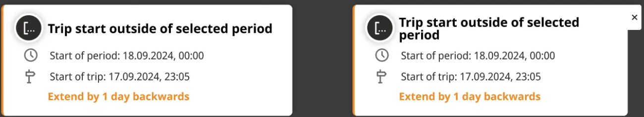 If the first trip in the trace began before the selected time period, the Start point will be replaced with a "Trip start outside of selected period" icon, marked with [… symbols.