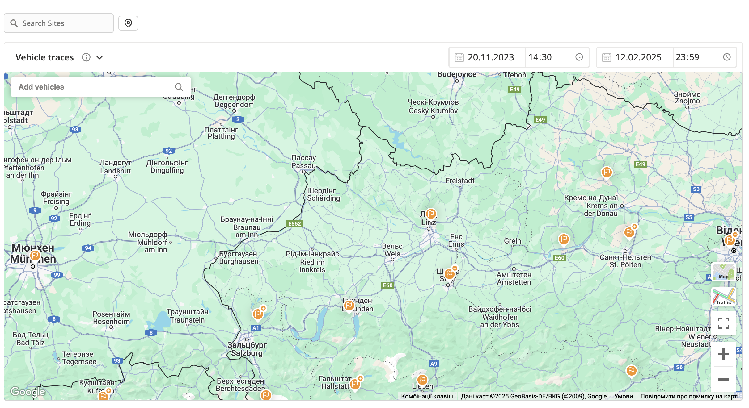 Vehicles Traces Mode allows you to view and analyze the movement history of selected vehicles within a specified time frame. This mode helps you track routes, monitor driving patterns, and review travel history.