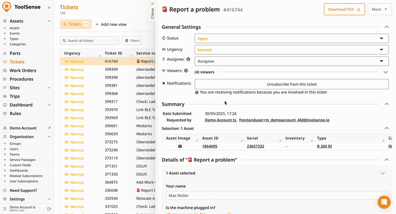 Making it much easier to collaborate - partners can view and manage assets as well as tickets directly in ToolSense, with in-app features like timelines, comments, and attachments.