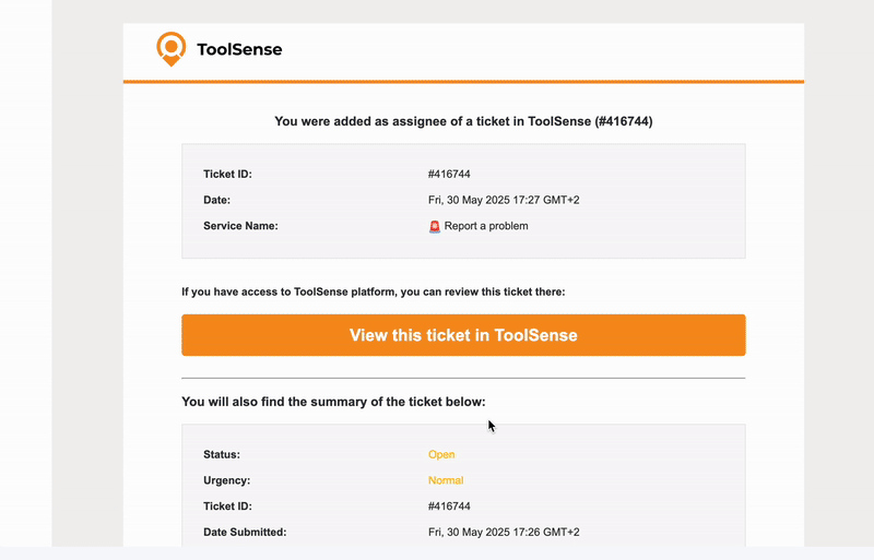 They can reply via email, and their messages will automatically appear in the ToolSense ticket thread (including attachments).