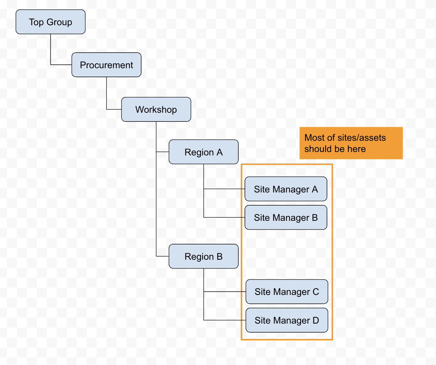Assign sites and assets to the lowest-level group where the responsible users sit to ensure proper access.