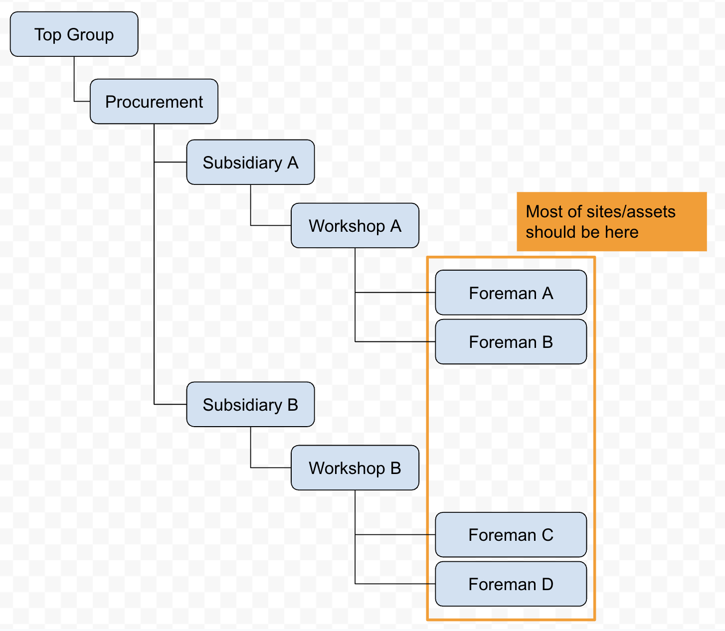 Assets should live in the lowest group level (e.g. Site Manager or Polier group)