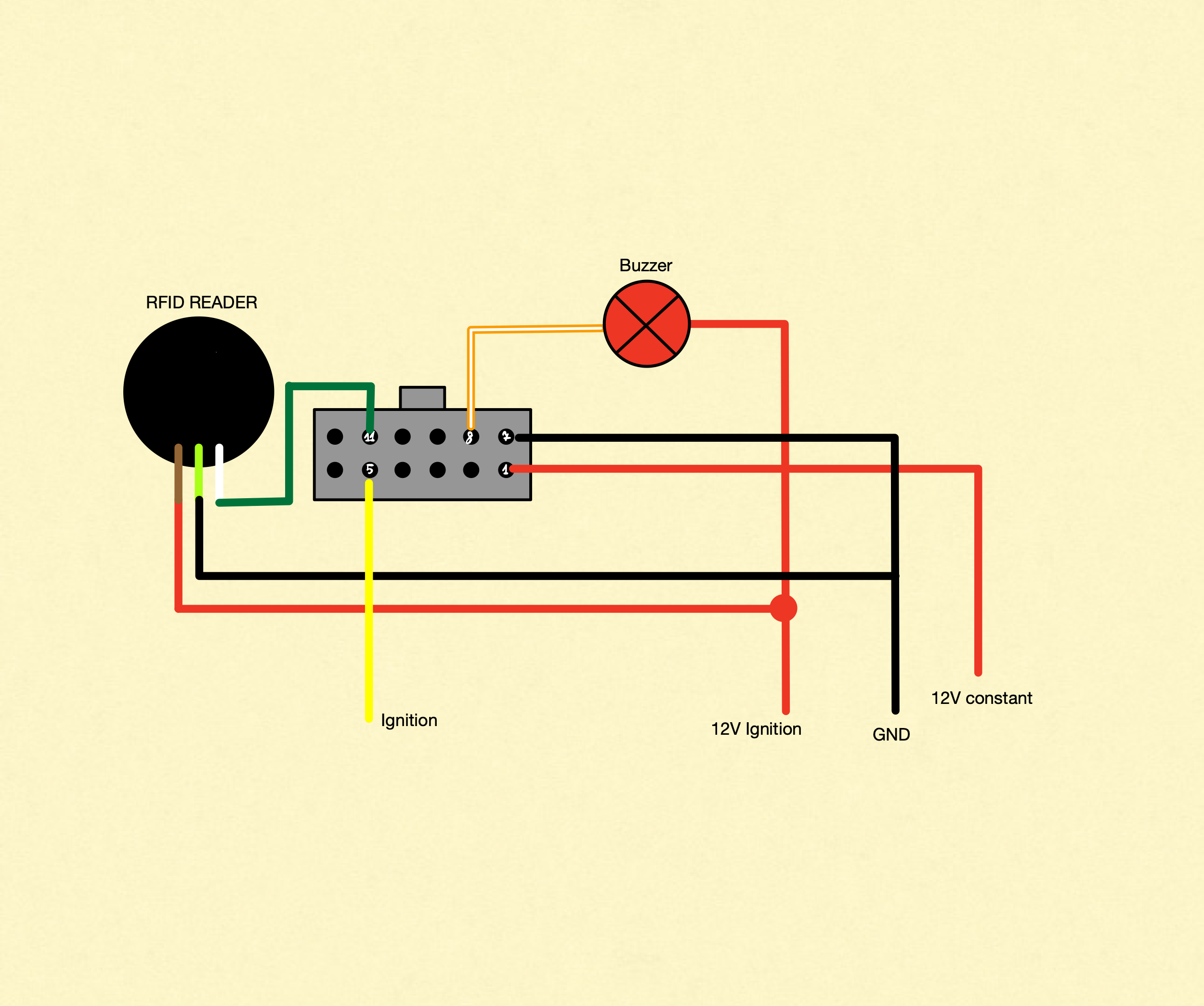 the colours of the wires on the image correspond to reality with the exception of "12V ignition", which is a wire coming from the vehicle/machine