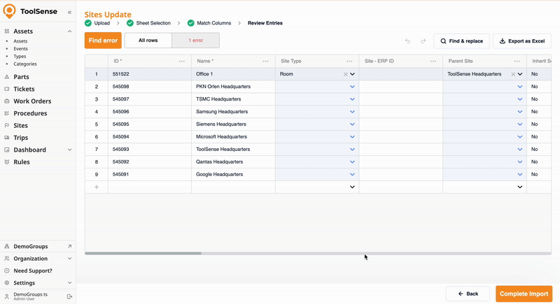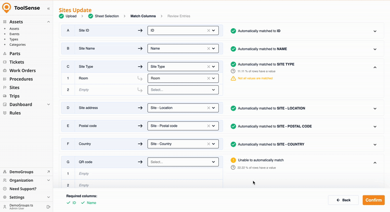 Once the mapping is complete, ToolSense will show you a preview of the data. Here, you can review any errors or conflicts. Make sure to check if all required fields are correctly set.