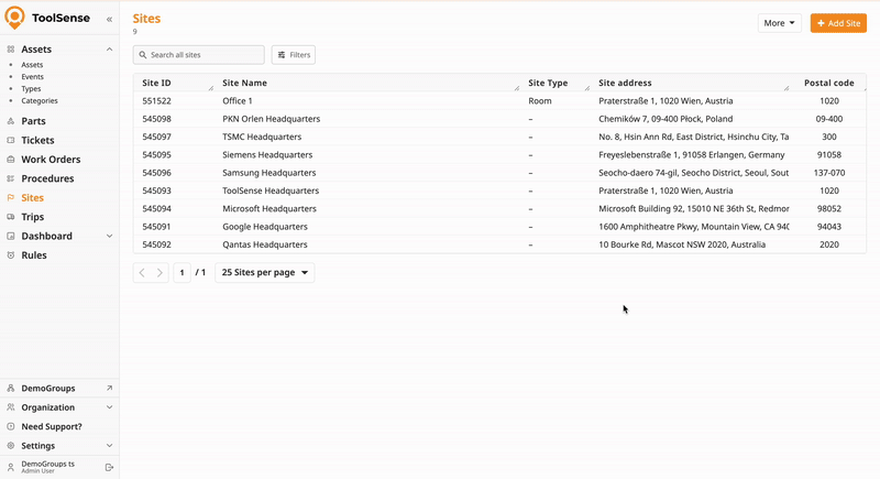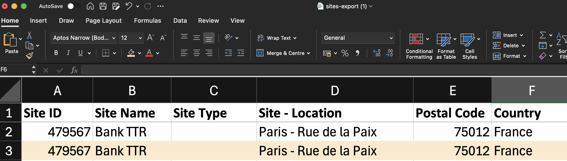 Export the Data: Start by exporting your existing site data from ToolSense to an Excel file. This can be done by navigating to the Sites tab in the left-hand navigation panel, then clicking on the More button and selecting Export Excel.