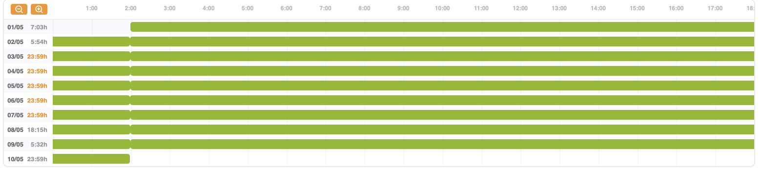 In case you're experiencing 24/7 runtime, resulting in green bars for the whole day, the problem you have is most likely an integration issue.