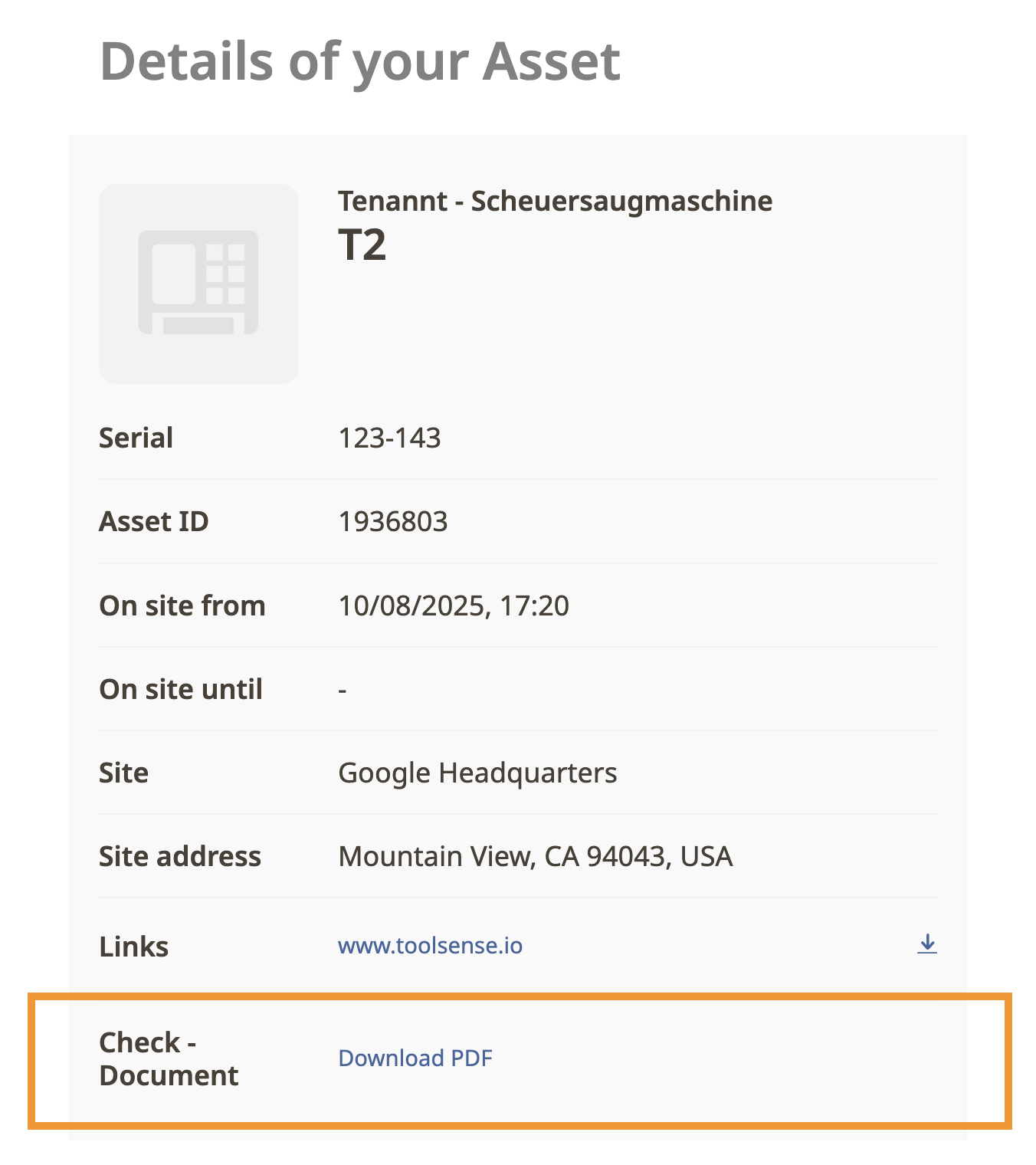 The protocol from the most recent check performed on an asset is automatically linked to its QR Code Landing Page, where it can be downloaded.