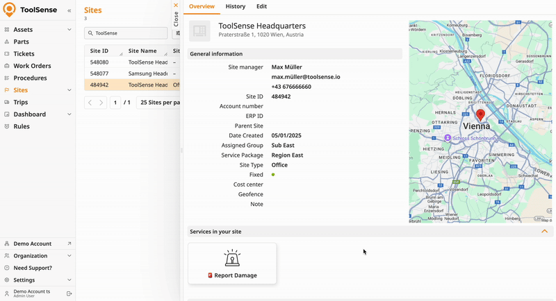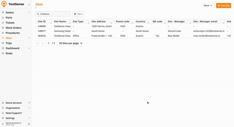 This article provides an overview of how to view and manage site data in ToolSense. For detailed step-by-step instructions on creating, editing, deleting, and bulk managing sites, please refer to the linked articles below.