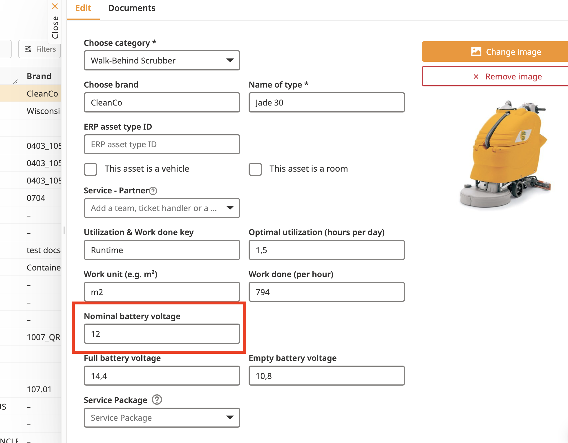 The nominal voltage level of the machine’s battery (e.g. 24V, 36V, 48V).