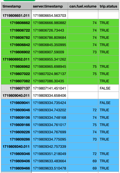 Let's say a vehicle starts a trip which is rather short in time, and ends it on a slope. The detected fuel level might end up being higher than the value measured at the beginning of the trip. A good example is a raw data export below from one of the modules.