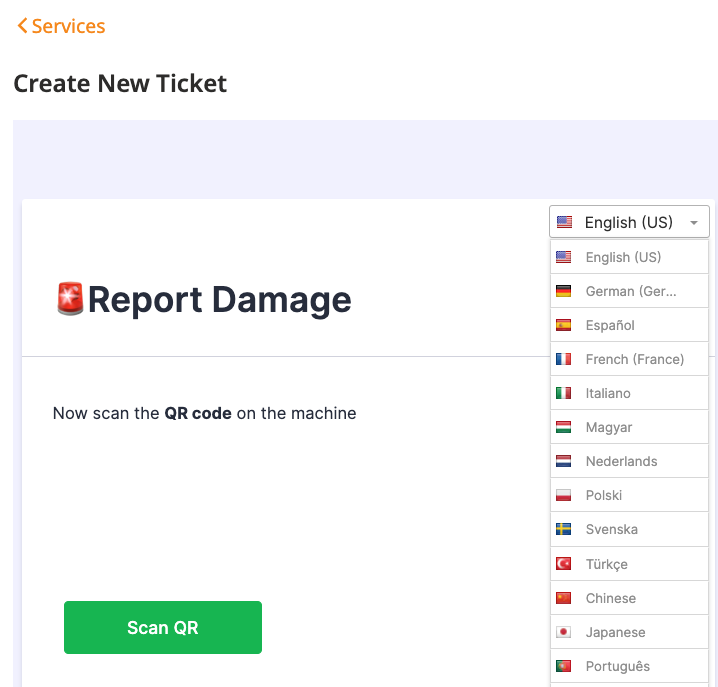 You can click on the small Globe and select the language you would like to use for the Service title in the ticket creation page.