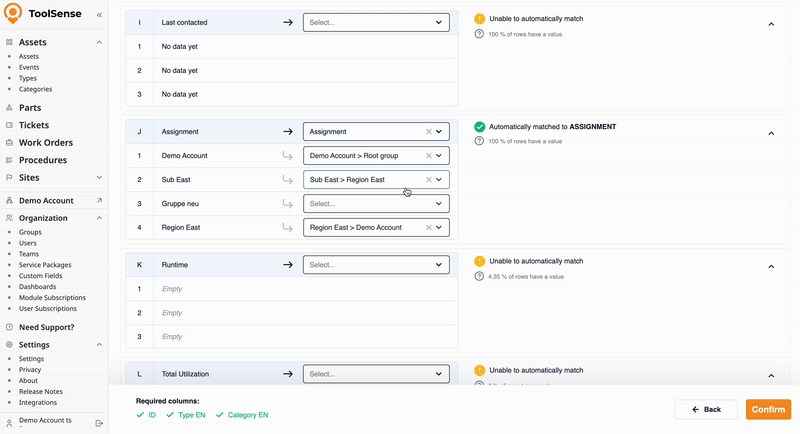 Example: Your ToolSense Group “Technic” is named “Technical Team“, make sure those values are matched correctly and adjust via the dropdown if needed