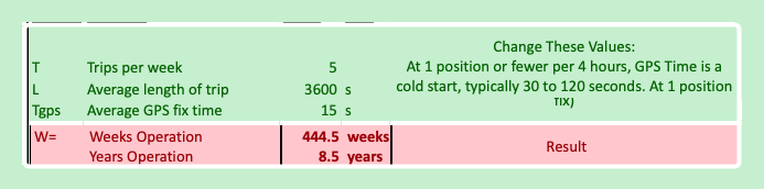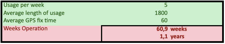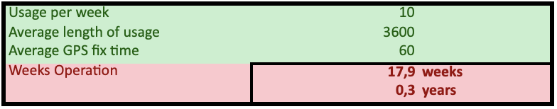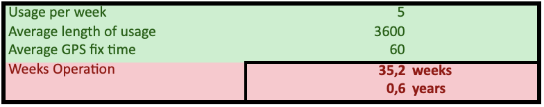 Example of an outdoor application, where GPS position can be acquired on a 15 second average with one hour runtime on every workday.